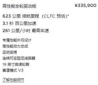 新款 Model 3 高性能全轮驱动版拥有 623 公里续航里程 (CLTC 预估)、3.1 秒百公里加速、261 公里 / 小时最高车速、专属性能外观设计、高性能动力总成、运动座椅、连续可变阻尼减振器、19 英寸曲速轮毂、赛道模式 V3。