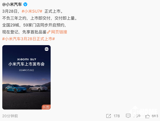3月12日,小米汽车官微发布消息称,小米汽车SU7将于2024年3月28日正式上市,上市即交付,交付即上量。全国29城,59家门店同步开启预约。值得注意的是,小米汽车还开设了15个限时体验厅。