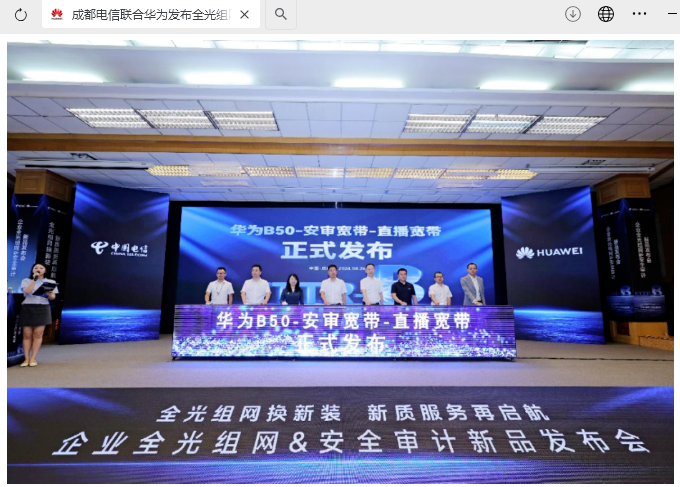 除此之外,成都电信商业客户中心副总经理李尚强还发布了全国首个安审宽带,将 FTTR-B 全光组网、安全审计合二为一,不仅为企业提供千兆网络接入,同时支持审计认证,可溯源、更智能守护企业网络安全。