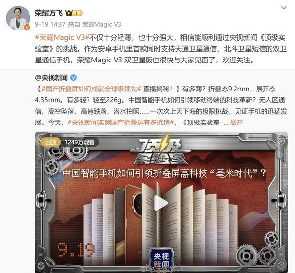 得益于荣耀鸿燕通信能力,荣耀一直在智能手机通信方面有着出色表现,也受到了消费者和行业的认可。在9月19日央视新闻播出的《顶级实验室》栏目中,荣耀Magic V3挑战了无人区通信,使用荣耀Magic V3在没有信号的无人区成功打出电话,让更多消费者看到了国产折叠屏产品的创新能力。