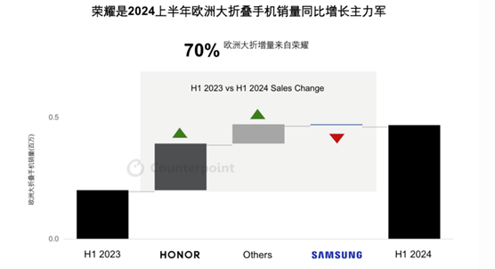 作为全球标志行科技品牌,荣耀技术创新也在辐射全球。根据Counterpoint发布的最新统计报告显示,2024年上半年相比2023年下半年,荣耀在欧洲的大折叠手机销量增长了22倍。