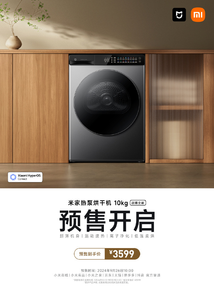 9月26号消息,米家洗衣机推出了全新热泵烘干机10kg,机身更薄、烘干更快、杀菌除螨更健康。全新热泵烘干机10kg今天正式开启预售,到手价3599元。