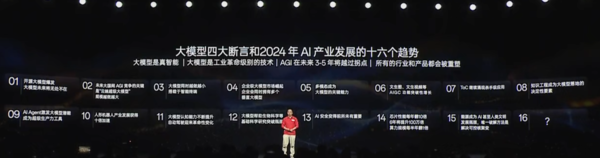 玩笑之后,周鸿祎正式开启了演讲。他首先列出了大模型四大断言和2024年AI产业发展的十六个趋势。周鸿祎表示,未来大模型会无处不在,并且重塑社会的很多方面。大模型会越来越大,会登录云端,同时也会很小,会渗入到电脑、手机等各种设备中。此外,其还谈及了AIGC、图生视频、机器人、芯片性能、能源需求等方面与AI的关系。