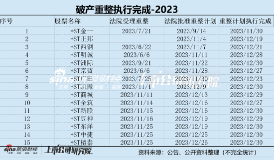 A股上市公司破产重整案例中,主要以ST公司居多。根据公开资料显示,2023年被法院裁定批准重整计划的*ST金一、*ST正邦、*ST豆神等15家均已计划执行完成。